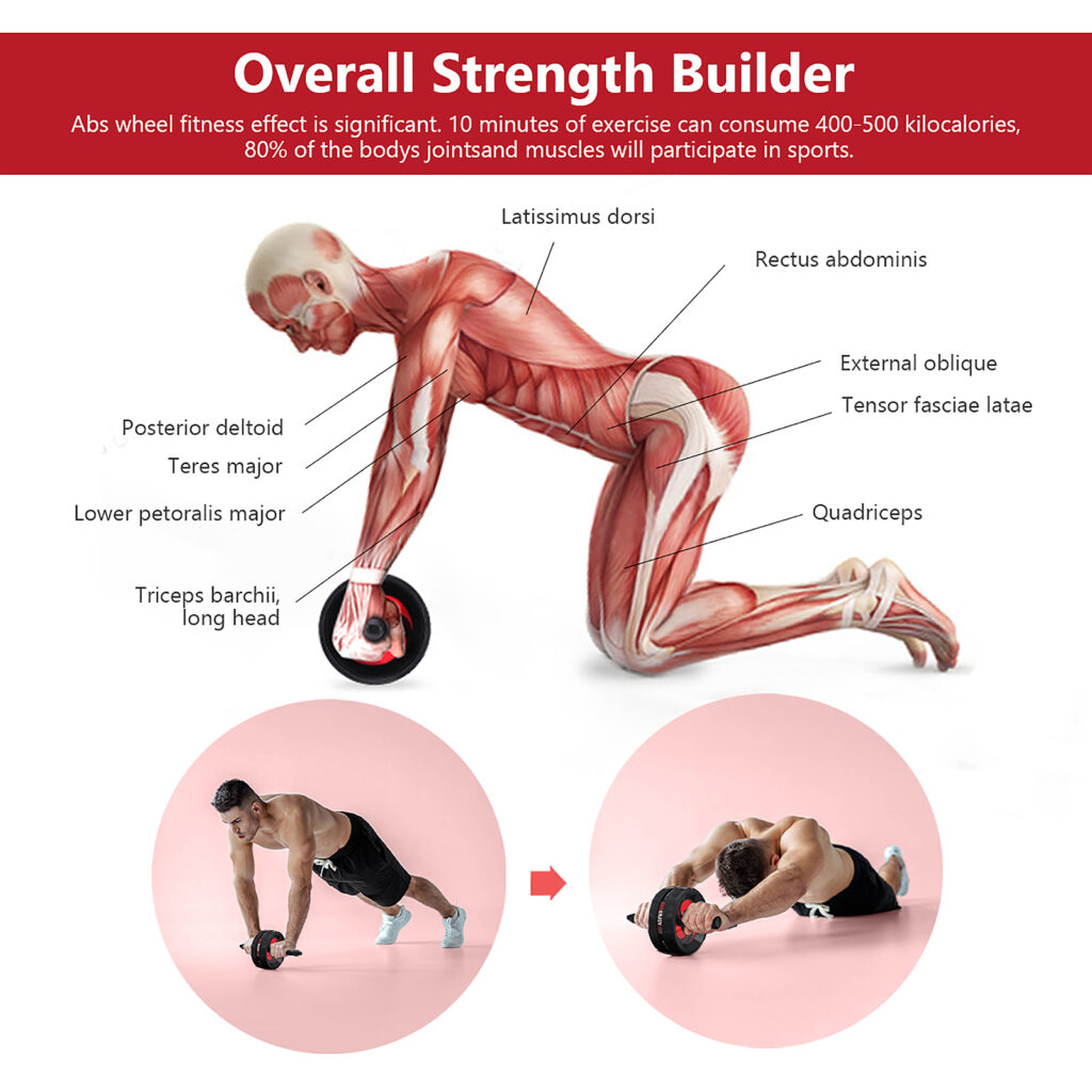 The abdominal wheel roller primarily targets the core muscles, which include the rectus abdominis, obliques, and the transverse abdominis. It also works the back, arm, and shoulder muscles